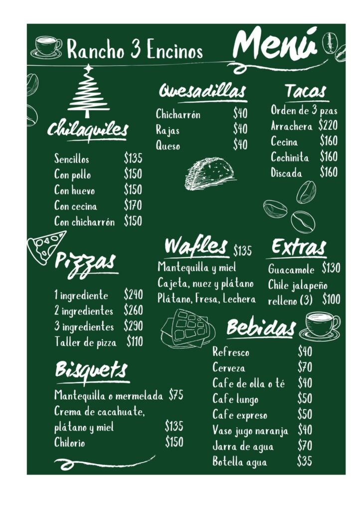 ¡Bienvenidos a una temporada navideña más en el Rancho Tres Encinos! Rancho Tres Encinos estará abierto a partir del sábado15 de noviembre al 24 de diciembre con un horario de 10 am a 6 pm CONOCE NUESTROS PAQUETES LOS ATRACTIVOS DERANCHO TRES ENCINOS CORTAR ARBOLES DE NAVIDAD Te han preguntado ¿donde cortar árboles de navidad? ven y hazlo. TIROLESAS PARA NIÑOS Y ADULTOS Hay para todos: jóvenes y adultos en la grande y los pequeños en la suya. GRANJA DIDÁCTICA Los niños tienenla oportunidad de convivir de cerca con los animalitos y alimentarlos. BICICLETA DE MONTAÑA Recorrer los sembradíos de pinos en bicicleta de montaña. JUEGOS AL AIRE LIBRE Juegos infantiles a la vista desde la terraza del restaurant NACIMIENTO NATURAL Nacimiento navideño de materiales naturales tamaño real Y muchos más!